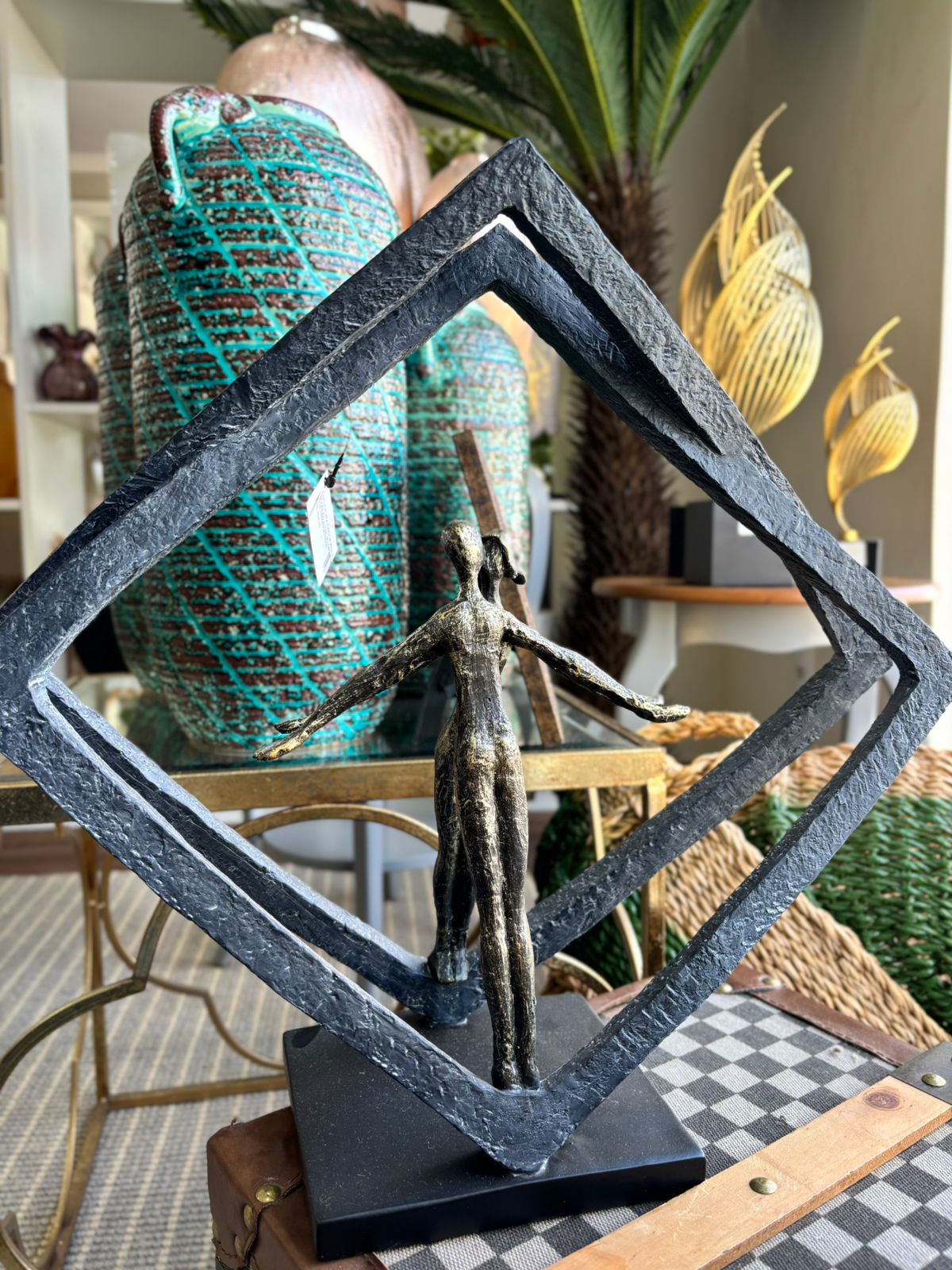 Com linhas expressivas e acabamento texturizado, essa escultura apresenta duas figuras humanas com detalhes em dourado, integradas em uma moldura geométrica metálica. A composição transmite equilíbrio, conexão e movimento, com um contraste elegante entre o preto fosco e os toques metálicos.