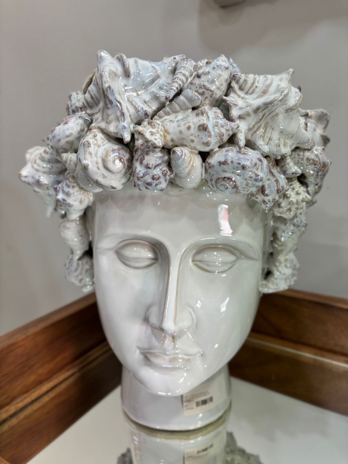 Uma peça escultórica e marcante, este vaso em cerâmica apresenta o formato de um rosto sereno adornado por conchas marítimas ricamente detalhadas. A combinação de formas humanas com elementos do fundo do mar cria uma estética refinada e ao mesmo tempo ousada.